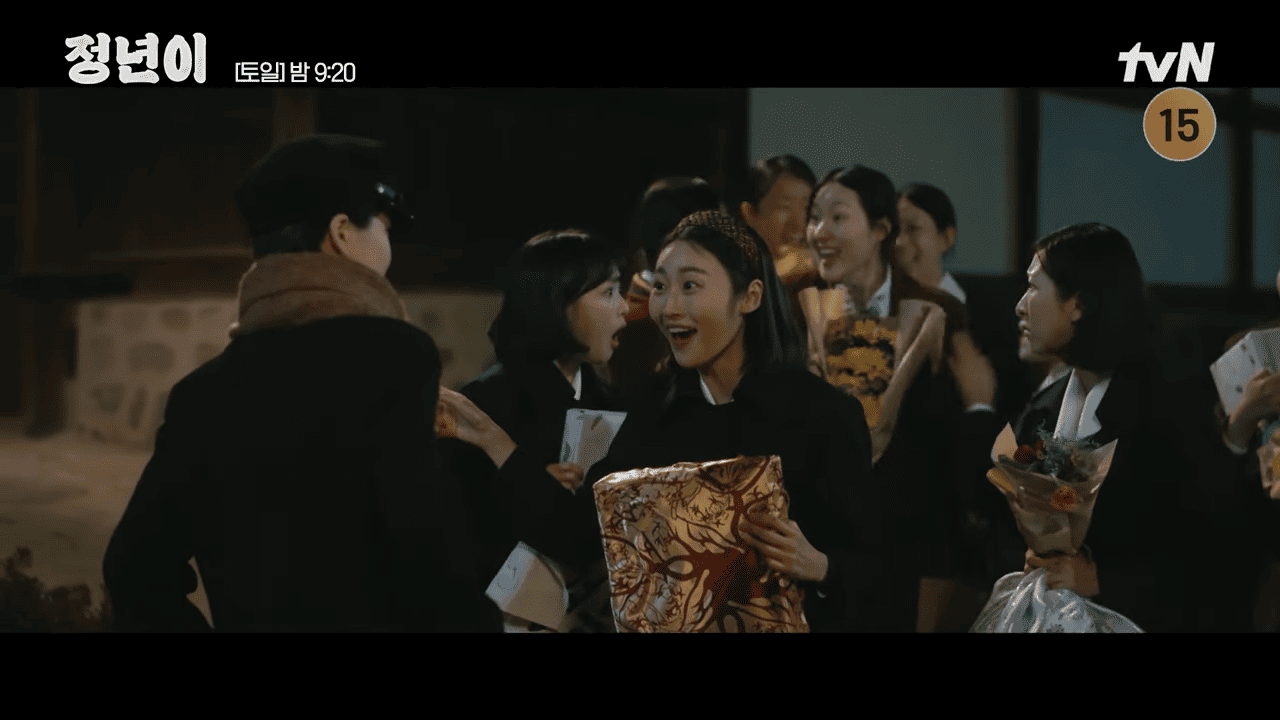 정년이는 군졸 역할을 완벽히 소화하기 위해 남학생으로 변신할 결심을 합니다. "이제부터 윤정년이 아닌 윤정식이여!"라며 남성 고등학생처럼 행동하기 시작한 그는 시내로 나가 중년 남성을 흉내 내 보기도 하고, 남학생들에게 쫓기면서 하루를 보냅니다. 비록 작은 역할이지만 이를 위해 열심히 몰입하는 정년이의 모습에서 연기에 대한 열정이 느껴집니다.